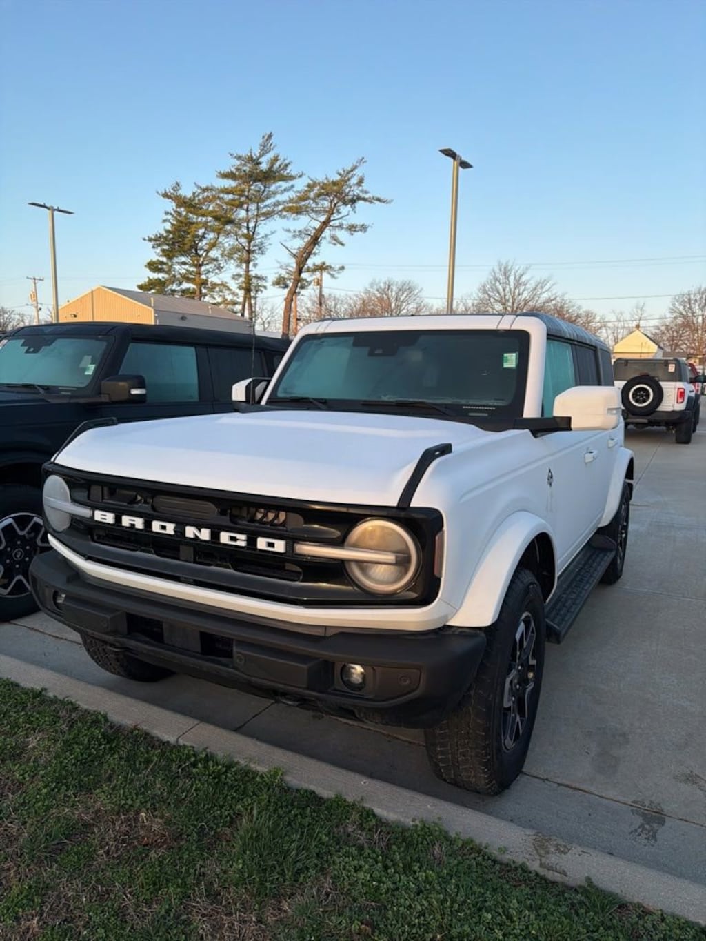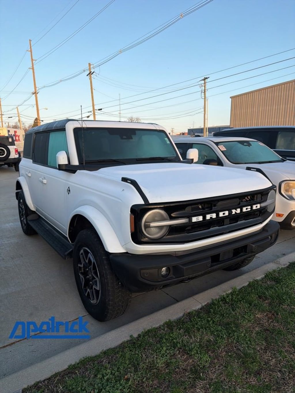 2025 Ford Bronco Outer Banks Recent Arrival! We want you to shop confidently for your next used car at The BIG Ford Store, D-Patrick Ford. We are located on Highway 41 and Walnut in Evansville, right next to the Lloyd Expressway. Buy this used vehicle 100% online or in-store. This pre-owned vehicle was put through an extensive inspection before hitting our lot. Because of this, we are able to offer a 3-month/3,000-mile comprehensive limited warranty. You also get our Love It or Return It 5-day, 300-mile Exchange Policy. See our website for more details on both. We also offer extended service plans, vehicle protection plans, and offer a CarFax vehicle history report. *Prices listed do not include a $250 documentation fee, applicable tax, title, tags, license, or $195 service and preparation. All pricing, vehicle information, and features (such as accessories and color) are believed to be accurate, but we do not warrant or guarantee such accuracy. The prices shown above may vary from region to region, and incentives are subject to change. Some offers listed may not be available to all customers. All online sale commitments are subject to confirmation of continued availability of vehicle. Once availability is confirmed, online sale agreement becomes binding upon the parties. If any information found on the website is thought to be erroneous, please verify information with a customer service representative. See dealer for full details. Looking to sell your current vehicle? We buy cars for cash. Every test drive at D-Patrick Ford in Evansville earns $10 to a local charity. Schedule your test drive today! 18 Bright Machined Aluminum Wheels, 3.73 Axle Ratio, 4-Wheel Disc Brakes, 7 Speakers, ABS brakes, Air Conditioning, Alloy wheels, AM/FM radio: SiriusXM with 360L, AM/FM Stereo, Auto High-beam Headlights, Auto-dimming Rear-View mirror, Automatic temperature control, Brake assist, Carbonized Gray Molded-In-Color Hard Top, Compass, Connected Navigation, Delay-off headlights, Driver door bin, Driver vanity mirror, Dual front impact airbags, Dual front side impact airbags, Electronic Stability Control, Emergency communication system: 911 Assist, Equipment Group 314A Lux Package, Exterior Parking Camera Rear, Ford Integrated Tether System (FITS) Accessory Pkg, Front & Rear Floor Liners, Front anti-roll bar, Front Bucket Seats, Front Center Armrest, Front dual zone A/C, Front fog lights, Front reading lights, Front wheel independent suspension, Fully automatic headlights, Hard Top Sound Deadening Headliner, Heated door mirrors, Heated front seats, Heated Leather-Trimmed/Vinyl Bucket Seats, Heated steering wheel, Illuminated entry, Integrated roll-over protection, Internet access capable: FordPass Connect, Leather Shift Knob, Low tire pressure warning, Navigation system: Connected Navigation, Occupant sensing airbag, Outside temperature display, Overhead airbag, Overhead console, Panic alarm, Passenger door bin, Passenger vanity mirror, Power door mirrors, Power driver seat, Power passenger seat, Power steering, Power windows, Radio data system, Rear seat center armrest, Remote keyless entry, Security system, SiriusXM w/360L, Speed control, Split folding rear seat, Steering wheel mounted audio controls, SYNC 4, Tachometer, Telescoping steering wheel, Tilt steering wheel, Traction control, Trip computer, Variably intermittent wipers, Voltmeter. CARFAX One-Owner. 4D Sport Utility Outer Banks 10-Speed Automatic 2.3L EcoBoost I-4 4WD Oxford White CALL TODAY (812) 625-4823 OR SHOP ONLINE AT WWW.DPATRICKFORD.COM.